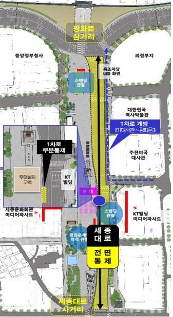 통제되는 곳은 광화문 삼거리에서 세종대로 사거리다. 다만 미국 대사관에서 광화문 삼거리 방향 1차로는 통행이 허용되고, 안국역 방향으로 우회전만 가능하다.