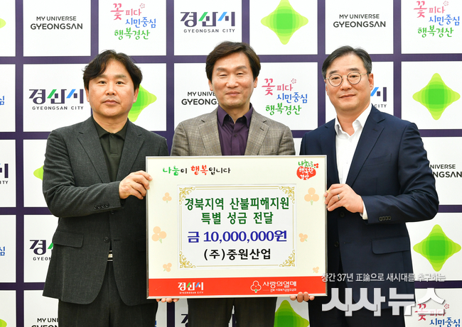 [시사뉴스 장시목 기자]경산시 진량읍 소재 (주)중원산업(대표이사 김명구)은 18일 경산시청을 방문하여 최근 대규모 산불로 피해를 입은 이재민들을 돕기 위해 성금 1,000만원을 기탁했다.
