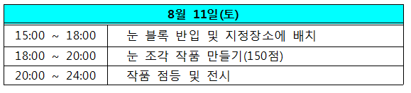 특히, 행사당일 오후 6시부터 12팀에게만 눈 조각 작품을 직접 만들 수 있는 기회가 주어진다. 가로X세로X높이 1m 정도의 입체 눈 블록 1점과 장비가 제공되며, 시작 전 숙련된 조교가 작업 요령 등을 설명해줄 예정이다. 전 과정이 약 2시간 정도 걸릴 것으로 예상된다.