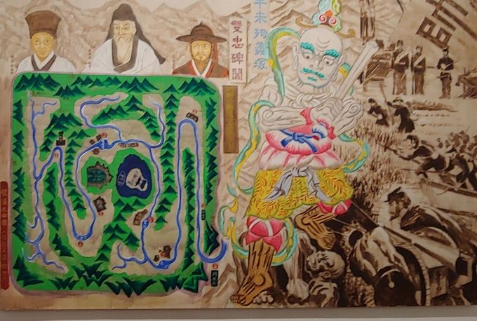 ‘수입리(양평)’(2016)은 동양화에서 흔히 볼 수 있던 전통적인 부감법과 투시도법을 재해석해 산과 강의 현재적 상황을 민화적으로 풀어낸다.