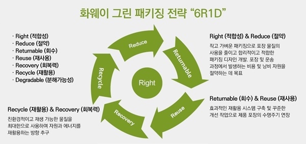 화웨이의 ‘6R1D’는 ▲Right (적합성) ▲Reduce (절약) ▲Returnable (회수) ▲Reuse (재사용) ▲Recovery (회복력) ▲Recycle (재활용) ▲Degradable (분해가능성)의 머리글자를 따서 지은 그린 패키징 전략이다.