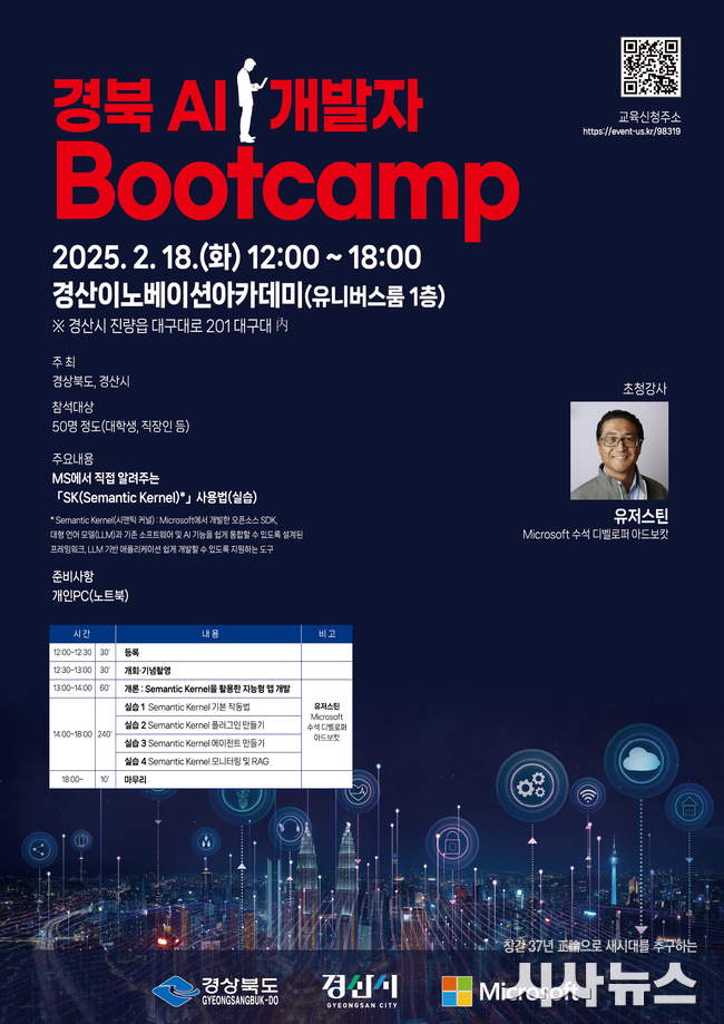 [시사뉴스 장시목 기자] 경산시(시장 조현일)는 Microsoft·경상북도·경산시가 공동 주최하는 『2025 경북 AI 개발자 부트캠프』를 오는 18일 12:30~18:00까지 경산이노베이션아카데미 1층 유니버스룸(경산시 진량읍 대구대로 201, 대구대학교 內)에서 개최한다고 밝혔다.