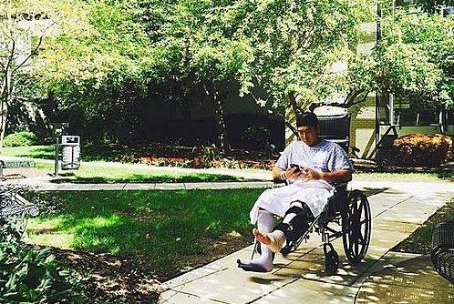 근황을 담은 사진도 함께 올라왔다. 환자복을 입은 채로 휠체어에 앉아 있었으며 수술을 받은 왼쪽 다리에는 깁스 위에 보호대를 착용했다.