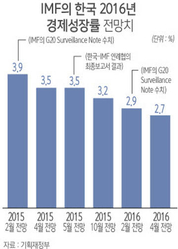 [시사뉴스 이종근 기자]국제통화기금(IMF)이 올해 우리나라의 성장률 전망치를 2%대로 낮췄다.IMF는 12일 발표한 세계경제전망(World Economic Outlook)에서 우리나라의 올해 경제성장률을 2.7%로 전망해 지난해 10월 전망(3.2%) 때보다 0.5%포인트 하향 조정했다.이번 전망치는 IMF가 지난 2월 'G20 감시 보고서'(G20 Surveillance Note)에서 제시한 2.9%보다도 0.2%포인트 낮아진 수치다.IMF의 올해 한국 성장률 전망치는 ▲2015년 2월 3.9%(G20 Surveillance Note 수치) ▲2015년 4월 3.5% ▲2015년 5월 3.5% ▲2015년 10월 3.2% ▲2016년 2월 2.9%(G20 Surveillance Note 수치) ▲2016년 4월 2.7% 등으로 계속 하락 중이다. IMF는 이번 성장률 전망치 하향조정 요인으로 중국의 수요 둔화를 꼽았다.우리나라의 내년 경제성장률 전망치도 2%대로 낮아졌다.IMF는 내년 우리나라의 경제성장률을 지난 2월 제시한 3.2%에서 0.3%포인트 낮춰 2.9%로 조정했다.IMF는 금융불안 증가, 자산·원자재 가격 하락 등에 따라 세계 경제 회복세가