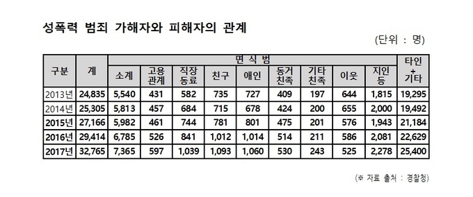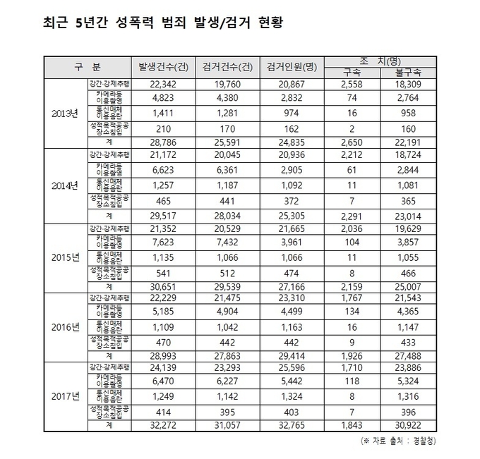 국회 보건복지위원회 인재근 의원(더불어민주당, 서울 도봉갑)이 경찰청으로부터 제출받은 자료에 따르면, 2017년도 성폭력 범죄 발생건수는 32,272건으로 2013년 28,786건에 비해 12%가 증가됐다. 2015년 30,651건, 2014년 29,517건, 2016년 28,993건 그리고 2013년이 28,786건 등의 순으로 나타났다.