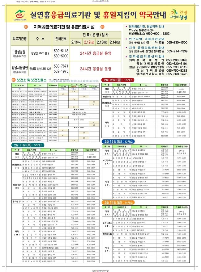 [시사뉴스 정윤철 기자] 창녕군(군수 한정우)은 설 명절 연휴기간인 오는 11일부터 14일까지 의료기관 및 약국 이용불편을 최소화하고, 다수 환자와 대량 응급환자 발생 등에 대비하고자 설 명절 연휴기간 문 여는 병(의)원 및 약국을 지정 운영한다.