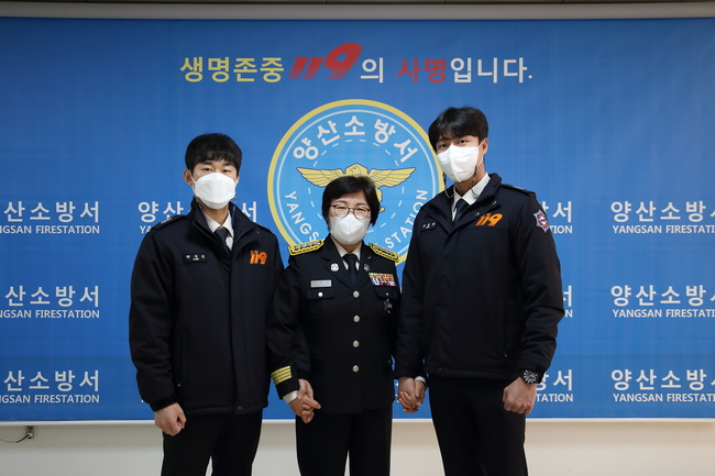 [시사뉴스 정윤철 기자] 양산소방서(서장 박정미)는 10일 오전 서장실에서 소방공무원으로 새 출발을 시작한 새내기 소방관 2명에 대한 격려와 소통의 시간을 가졌다고 밝혔다.