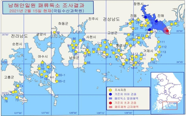 이 같은 사실은 지난 2월 15일 경남 진해만과 부산시 가덕도 천성 연안에 대한 마비성패류독소 조사에서 밝혀졌다. 또한 경남 창원시 덕동동, 명동 및 거제시 칠천도 대곡리 연안에서도 기준치를 밑도는 독소가 검출됐다.