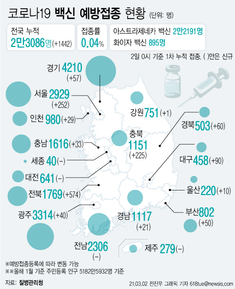 [시사뉴스 황수분 기자] 국내 신종 코로나바이러스 감염증(코로나19) 백신 접종 나흘째인 지난 1일, 전국에서 1442명이 추가로 예방 접종을 받았다. 이로써 누적 접종자는 2만3086명으로 늘어났다.