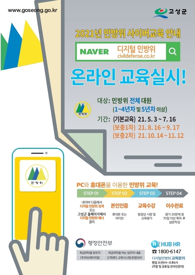 이번에 실시하는 민방위 사이버교육은 고성군에 주소를 둔 지역·직장민방위대원을 포함한 전 대원을 대상으로 하며, 스마트폰이나 PC를 이용해 시간과 장소에 구애받지 않고 교육을 이수할 수 있다.