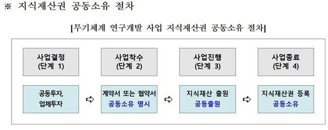 방위사업청은 지식재산권 관리지침과 국방과학 기술료 산정·징수방법 · 징수절차 등에 관한 고시를 개정해 국방 연구개발에서 창출된 지식재산권을 민간기업을 포함한 개발 참여기관과 공동 소유·활용한다고 4일 밝혔다.