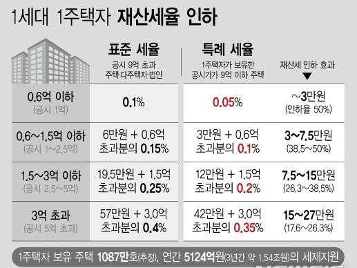 이 개정안은 1세대 1주택자에 대한 재산세율 특례 적용 대상을 현행 공시지가 '6억원 이하'에서 '9억원 이하'로 확대하는 게 골자다.