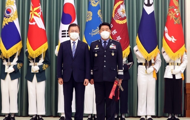 문 대통령은 이날 오후 2시30분 청와대 본관 충무실에서 박 총장에게 진급 및 보직 신고를 받고, 호국·통일·번영의 의미를 담고 있는 삼정검(三精劍)에 수치(綬幟·끈으로 된 깃발)를 수여했다.