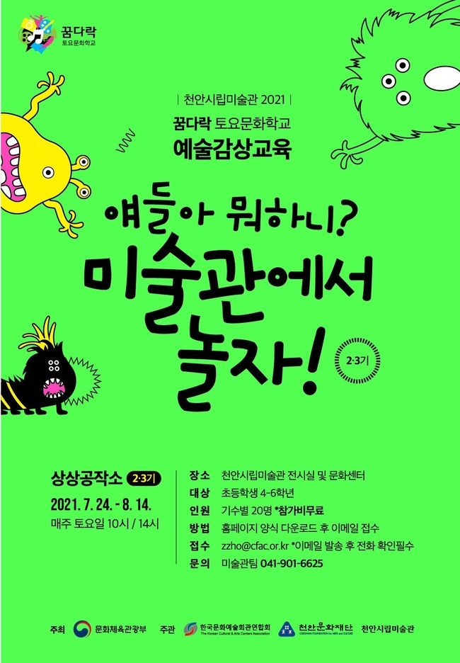 [시사뉴스 홍경의 기자] 충남 천안시립미술관이 7월 6일부터 2021 꿈다락 토요문화학교 ‘얘들아 뭐하니? 미술관에서 놀자 – 상상공작소’ 2·3기 참여자를 모집한다.
