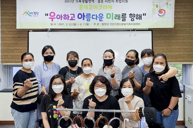 [시사뉴스 정윤철 기자] 합천군(군수 문준희) 건강가정다문화가족지원센터는 지난 3월 22일부터 6월 7일까지, 매주 월요일 10명의 여성결혼이민자를 대상으로 홈데코마크라메 2급 강사 자격과정을 운영하여 10명 전원 자격증을 취득하는 쾌거를 이뤘다.