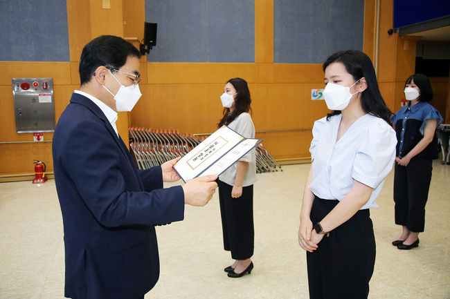 시는 사회적 거리두기 4단계임을 감안해 최소한의 인원으로 4회에 걸쳐 임용식을 나눠 실시했으며, 체온측정, KF 마스크 착용 등 코로나 방역수칙을 철저히 준수하며 진행했다.