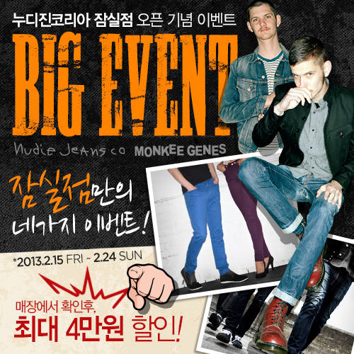 누디진코리아 잠실점은 스웨덴 프리미엄진 브랜드 누디진 외에도다양한 컬러 구성과 스타일로 전 세계의 젊은층으로부터 많은 사랑을 받고 있는 영국 프리미엄 브랜드 몽키진도 함께 만나볼 수 있다.