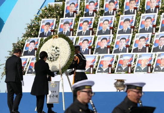 박 대통령은 또 추모사를 통해 “천안함 3주기를 맞아 북한의 변화를 강력하게 촉구한다”며 “북한은 핵무기가 체제를 지켜줄 수 있다는 생각에서 하루빨리 벗어나야 한다. 핵무기와 미사일, 도발과 위협을 스스로 내려놓고 국제사회의 책임 있는 일원으로 변하는 것만이 북한이 생존할 수 있는 유일한 길”이라고 강조했다