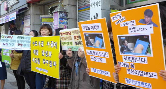 안양YWCA, 안양여성의 전화, 안양나눔여성회 등 여성단체회원들은 27일 안양시 동안구 호계동 심 의원 사무실 앞에서 시위를 열고 “국가의 정책, 법률, 예산을 심의하는 의원이 국회 본회의 중 본연의 역할을 하지 않고 누드사진을 검색해 보는 행동은 지탄받아 마땅하다”며 국민에게 사과와 윤리특위 위원을 사퇴하라고 주장했다