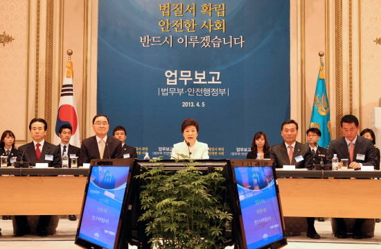 박 대통령은 “우리 사회의 범죄를 근본적으로 줄이려면 법이 공정하게 집행된다는 믿음이 국민 마음속에 쌓여야 한다”며“법을 지키는 게 오히려 손해를 보고 어겨도 돈과 권력으로 법망을 빠져나가는 사회에선 범죄확산을 막기 어렵다”고 강조했다.