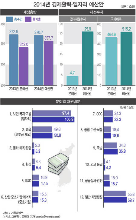 기획재정부는 26일 총수입 370조7000억원, 총지출 357조7000억원 규모의 '2014년도 예산안'을 발표했다. 관리재정수지는 GDP대비 -1.8%로 25조9000억원의 재정 적자가 불가피해졌다. 이에 따라 국가채무는 올해 480조3000억원에서 내년에는 515조2000억원으로 증가할 것으로 예상된다.