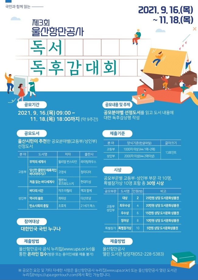 [시사뉴스 정윤철 기자] 울산항만공사(UPA, 사장 김재균)는 오는 16일부터 11월 18일까지 가을을 맞아 전국의 고등학생과 성인을 대상으로 제3회 독서독후감대회를 개최한다고 밝혔다.