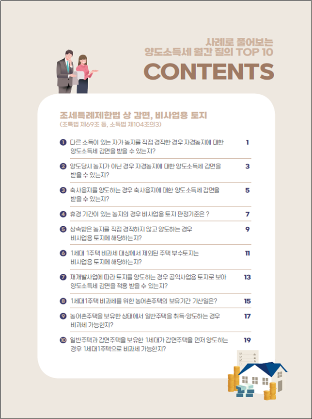 국세청은 '조세특례제한법 상 감면, 비사업용 토지'에 대한 사례로 ▲다른 소득이 있는 자가 농지를 직접 경작한 경우 자경농지에 대한 양도소득세 감면을 받을 수 있는지 ▲축사용지를 양도하는 경우 축사용지에 대한 양도소득세 감면을 받을 수 있는지 ▲휴경 기간이 있는 농지의 경우 비사업용 토지 판정기준은 ▲상속받은 농지를 직접 경작하지 않고 양도하는 경우 비사업용 토지에 해당하는지 ▲1세대 1주택 비과세 대상에서 제외된 주택 부수토지는 비사업용 토지에 해당하는지 ▲1세대 1주택 비과세를 위한 농어촌주택의 보유기간 기산일은 ▲농어촌주택을 보유한 상태에서 일반주택을 취득·양도하는 경우 비과세 가능한지 등을 제8회 사례집에 주요내용으로 실었다.