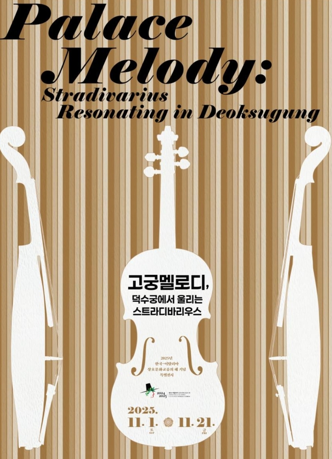 [시사뉴스 정춘옥 기자] 국가유산청 궁능유적본부 덕수궁관리소(소장 이승재)와 주한 이탈리아대사관(대사 에밀리아 가토)은 오는 11월 1일부터 11월 21일까지 덕수궁 돈덕전(서울 중구)에서 ‘한국-이탈리아 상호문화교류의 해’를 기념하는 특별전 '고궁멜로디, 덕수궁에서 울리는 스트라디바리우스'를 개최한다.