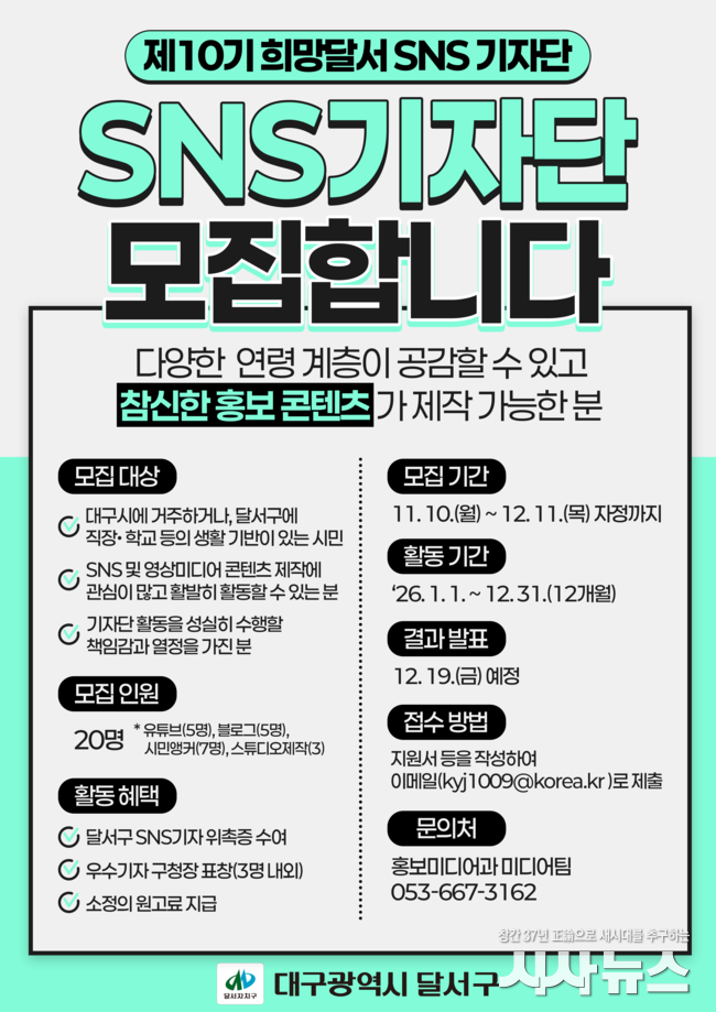 [시사뉴스 장시목 기자]대구 달서구(구청장 이태훈)는 구민이 직접 참여해 지역의 소식을 생생하게 전하는 제10기 ‘희망달서 SNS기자단’을 오는 **12월 11일(목)**까지 모집한다.