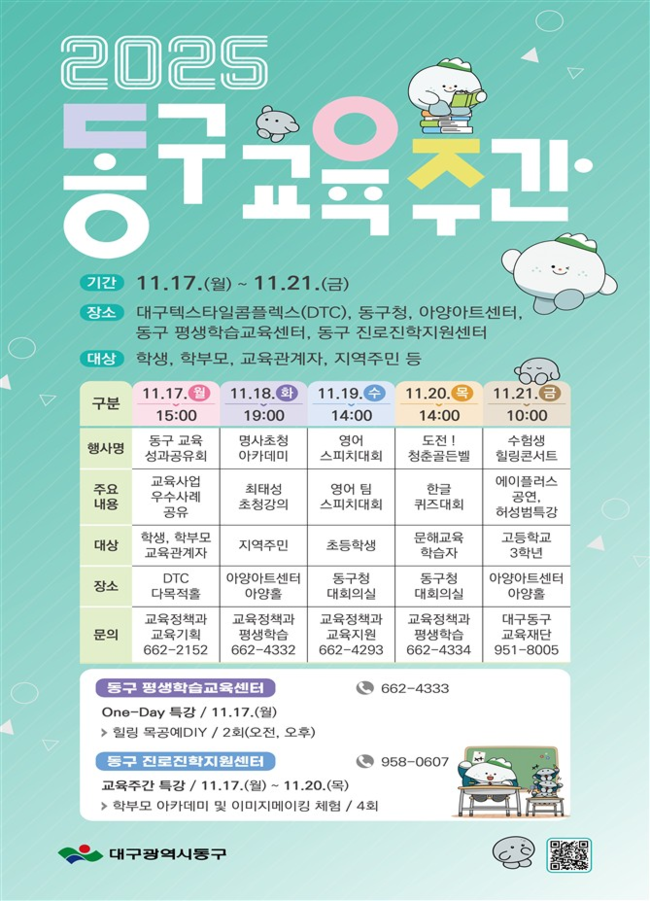 [시사뉴스 이성동 기자] 대구 동구청(구청장 윤석준)은 오는 11월 17일부터 21일까지 5일간 ‘2025 동구 교육주간’을 운영한다.