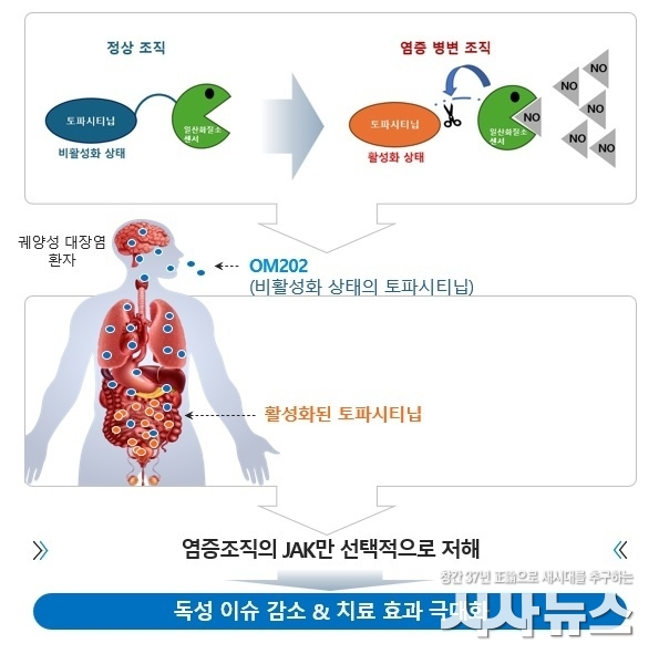 ○ ‘OM202’는 NSDC(Nitric oxide Scavenger Drug Conjugate) 플랫폼 기반 후보물질로 대표적인 JAK* 억제제인 토파시티닙에 일산화질소(Nitric oxide) 센서를 결합한 신개념 저분자 치료제다. 염증 부위에서만 약효가 발현되도록 설계한 것이 특징이며 이를 통해 기존 약물의 전신적 부작용 문제를 줄이는 동시에 병변 부위에서의 약효를 극대화할 수 있을 것으로 기대된다.