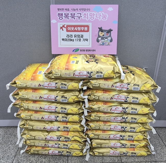 [시사뉴스 이성동 기자] 대구 북구 동천동 라라유외과(원장 문소향)는 12월 18일(목) 동천동 행정복지센터(동장 윤필남)를 방문해 지역 내 어려운 이웃을 위해 100만원 상당의 백미 20kg 17포를 기탁했다.