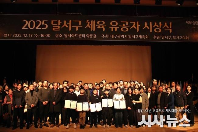 [시사뉴스 장시목 기자]대구 달서구(구청장 이태훈) 달서구체육회(회장 윤영호)는 지난 17일 달서아트센터에서 ‘2025 달서구 체육유공자 시상식’을 개최하고, 한 해 동안 달서구 체육 발전에 기여한 체육인들을 격려하는 뜻깊은 시간을 가졌다.
