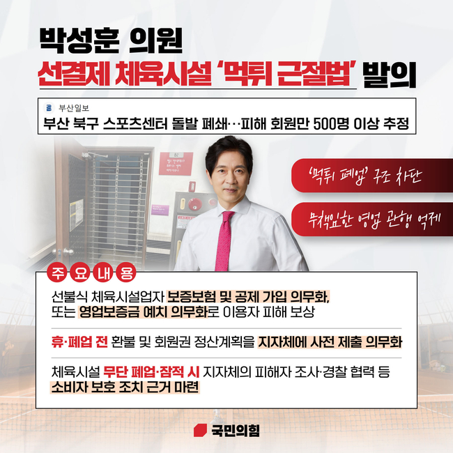 국민의힘 박성훈 의원(부산 북구을, 기획재정위원회, 초선)은 24일 ‘체육시설의 설치·이용에 관한 법률’ 일부개정법률안을 대표발의했다.