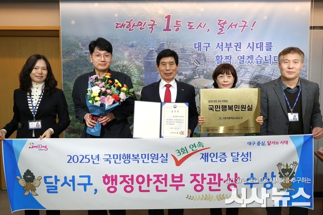 [시사뉴스 장시목 기자]대구 달서구(구청장 이태훈)는 행정안전부가 주관한 ‘2025년 국민행복민원실’ 인증에서 3회 연속 재인증을 받았으며, 민원행정 분야 우수기관으로 선정돼 행정안전부 장관상을 수상하는 영예를 안았다.