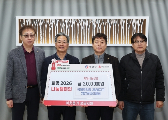 [시사뉴스 김재홍 기자] 국제로타리 3630지구 영양로타리클럽(회장 황영호)은 1월 26일 「희망2026나눔캠페인」에 동참해 지역의 어려운 이웃을 돕기 위한 성금 200만원을 영양군청에 전달했다.