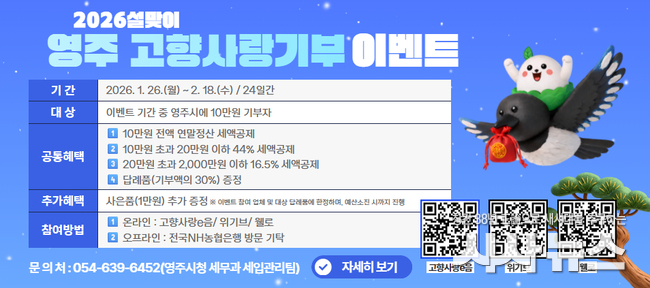 [시사뉴스 장시목 기자]영주시는 설 명절을 맞이해 고향사랑기부제 참여를 확대하고 지역경제 활성화를 도모하기 위해 설맞이 고향사랑기부 사은품 증정 이벤트를 추진한다고 지난 26일 밝혔다.