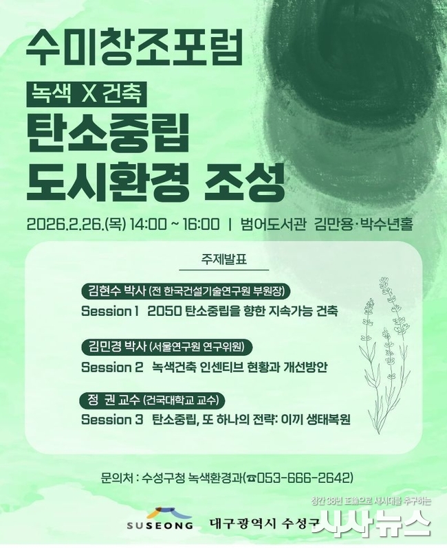 [시사뉴스 이성동 기자] 대구 수성구(구청장 김대권)는 이달 26일 ‘녹색×건축: 탄소중립 도시환경 조성’을 주제로 범어도서관 김만용·박수년홀에서 ‘수미창조 포럼’을 개최한다고 밝혔다.