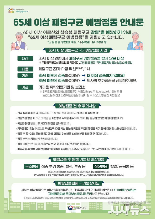폐렴구균 예방접종은 65세 이상 어르신을 대상으로 평생 1회 접종하는 백신으로, 중증 합병증을 효과적으로 예방할 수 있다. 2026년 새롭게 65세가 되는 1961년생(1961년 12월 31일 이전 출생자)도 국가예방접종 지원 대상에 포함돼 무료 접종이 가능하다.