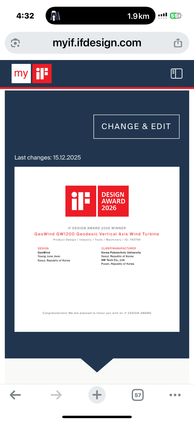 [시사뉴스 홍경의 기자] 대한민국의 수직축 풍력발전 기술 기업 지오윈드(GeoWind)가 자사의 대표 모델 ‘GeoWind GW1200 Geodesic Vertical Axis Wind Turbine’로 iF DESIGN AWARD 2026를 수상했다고 밝혔다.