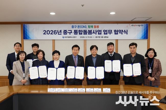 [시사뉴스 이성동 기자] 대구 중구(구청장 류규하)는 지난 11일 구청 상황실에서 ‘중구 온(ON), 함께 돌봄’ 통합돌봄 지역특화사업의 안정적 추진을 위해 관내 7개 기관과 업무협약을 체결하고, 민·관 협력 기반의 지역 통합 돌봄 체계 구축에 나섰다.