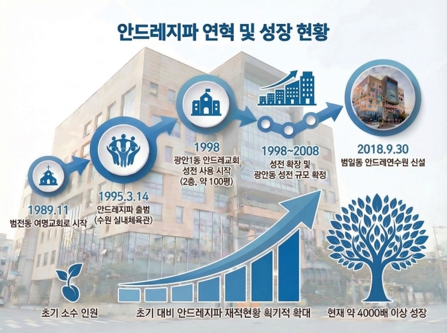 안드레지파의 출발은 1989년 부산 범전동 30평 규모의 작은 예배처였다. 당시에는 소수 인원이 모이는 지역 공동체 수준이었지만, 이 공간은 이후 지파 성장의 출발점이 됐다.