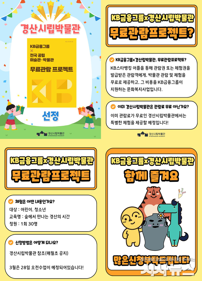 [시사뉴스 장시목 기자]경산시(시장 조현일) 시립박물관은 KB금융그룹이 추진하는 ‘전국 공립 미술관·박물관 무료 관람 프로젝트’에 선정되어, 어린이~성인 대상 체험교육 프로그램을 운영한다고 밝혔다.
