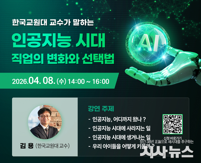 강연은 한국교원대학교 김용 교수가 맡아 인공지능 기술의 현재 수준과 함께 변화하는 직업 세계를 분석하고, 사라지거나 새롭게 등장하는 직업군의 흐름을 설명할 예정이다. 또한 미래 사회가 요구하는 핵심 역량과 교육 방향에 대해서도 심도 있게 다룬다.