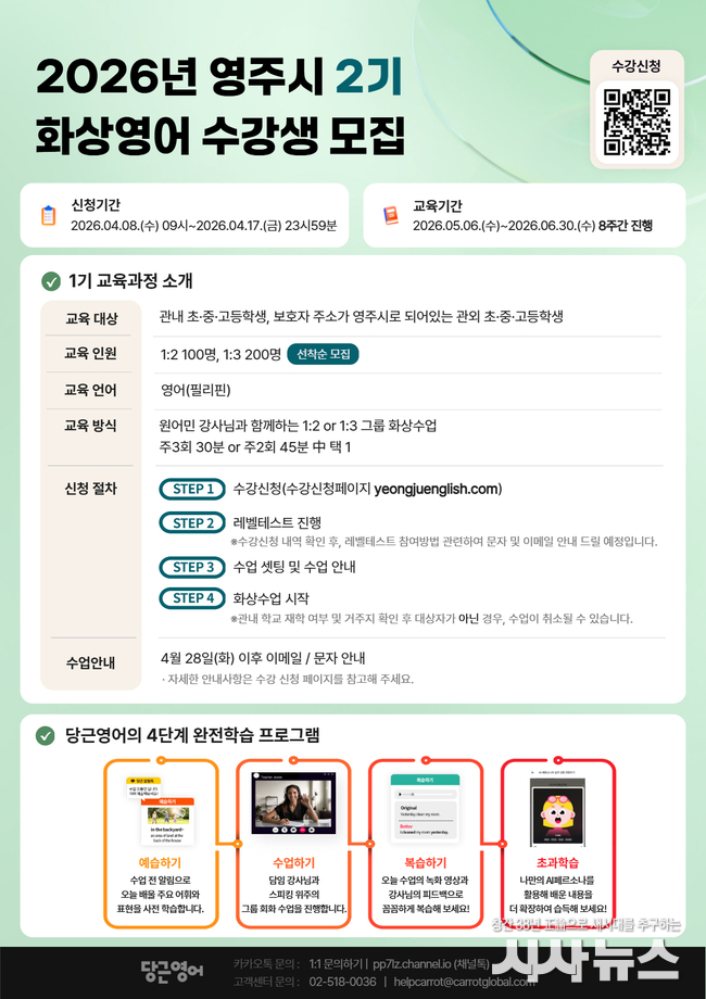 [시사뉴스 장시목 기자]영주시는 4월 8일부터 17일까지 ‘2026년 원어민 사이버 화상영어’ 제2기 수강생을 선착순으로 모집한다.