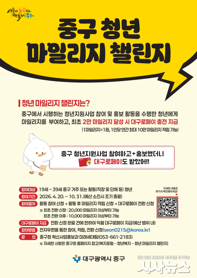 [시사뉴스 이성동 기자] 대구 중구는 청년들의 청년지원사업 참여를 확대하고 정책 인지도와 체감도를 높이기 위해 ‘청년 마일리지 챌린지’를 4월 20일부터 10월 31일까지 시행한다.