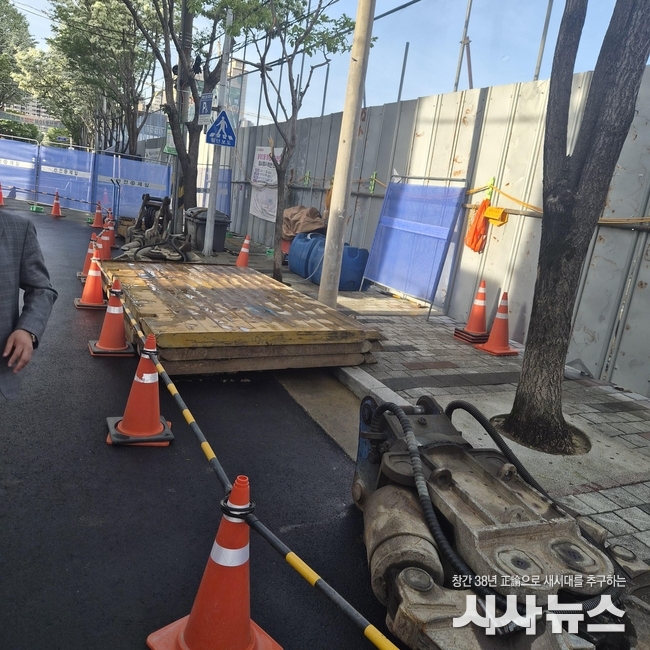 시사뉴스가 2026년 4월 22일 촬영한 현장 사진에 따르면, 공사 구간 내 인도 및 차도 일부에 대형 중장비 부속물과 철판, 각종 공사용 자재가 장시간 방치된 상태로 확인됐다.