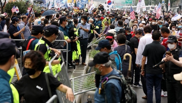 이날 전광훈 목사가 이끄는 사랑제일교회와 자유연대 등 보수단체들은 서울 종로구 경복궁역 인근에서 정부와 여당을 규탄하는 집회를 진행했다.