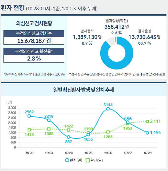 [시사뉴스 신선 기자] 중앙방역대책본부(본부장 정은경 청장)는 10월 28일 0시 기준으로, 국내 발생 신규 확진자는 2,095명, 해외유입 사례는 16명이 확인되어 총 누적 확진자 수는 358,412명(해외유입 15,040명)이라고 밝혔다.