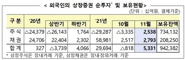 지난달 말 현재 외국인은 상장주식 734조1000억원(시가총액의 28.3%), 상장채권 208조3000억원(상장잔액의 9.3%) 등 총 942조4000억원의 상장증권을 보유했다.